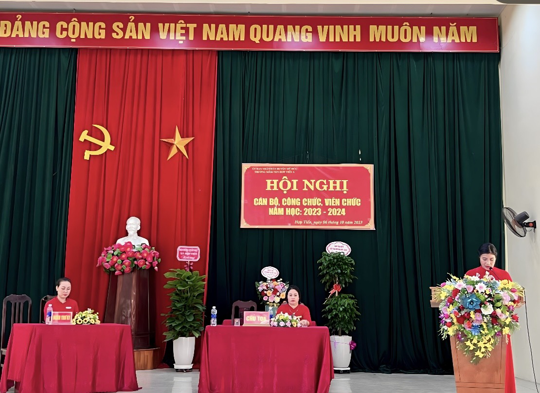 07/10/2023 A- A A+ | HỘI NGHỊ CÁN BỘ CÔNG CHỨC VIÊN CHỨC NĂM HỌC 2023-2024 Xem Chia s? HỘI NGHỊ CBCCVC NĂM HỌC 2023-2024 Thực hiện kế hoạch số 05/HD - LN ngày 5 tháng 09 năm 2023 về việc tổ chức hội nghị cán bộ, công chức, viên chức năm học 2023 - 2024 Hôn nay ngày 06 tháng 10 năm 2023 Trường mầm non Hợp Tiến A đã long trọng tổ chức Hội nghị CBCCVC người lao động năm học 2023 - 2024 nhằm đánh giá kết quả thực hiện Nghị quyết: Quy chế dân chủ năm học 2022 – 2023 và phương hướng chỉ tiêu nhiệm vụ năm học 2023 - 2024, đồng thời ký cam kết trách nhiệm giữa Công đoàn và nhà trường, phát động phong trào thi đua và giải đáp những thắc mắc của cán bộ viên chức trong nhà trường, giúp nhà trường thực hiện tốt nhiệm vụ năm học 2023 - 2024. Về dự với hội nghị cán bộ công chức viên chức của trường mầm non Hợp Tiến A ngày hôm nay có: +Đoàn đại biểu của xã Hợp Tiến có: 1.Đồng chí: Nguyễn Văn Bắc-Bí thư Đảng ủy-Chủ Tịch HĐND xã 2.Đồng chí Nguyễn Văn Bái- Phó Bí thư Thường trực Đảng ủy 3.Đồng chí Trần Văn Phiu - Phó bí thư Đảng ủy- Chủ tịch UBND xã 4.Đồng chí Trần Văn Hừng - Đảng ủy viên-Phó chủ tịch UBND xã 5.Đồng chí Nguyễn Đình Chất - Đảng ủy viên-Phó chủ tịch UBND xã 6.Đồng chí Đào Thị Luyến - Đảng ủy viên- phụ trách Cùng các đồng chí trong ban thường trực Đảng ủy, HĐND,UBND, MTTQ xã đã về dự đã có giỏ Hoa chúc mừng Hội Nghị. + Đoàn đại biểu Hội đồng Giáo Dục xã Hợp Tiến Có Các đồng chí Bí thư chi bộ - Hiệu trưởng các trường MN, TH,THCS đã về dự và có chậu cây xanh chúc mừng hội nghị. + Đại biểu đại diện Hội phụ huynh học sinh có: -Ông Hoàng Gia Trối - Phó Trưởng ban thường trực hội ông bà cha mẹ học sinh toàn trường cùng các ông bà trong ban thường trực hội cha mẹ học sinh toàn trường về dự đã có chậu cây xanh chúc mừng hội nghị. + Cùng về dự với hội nghị có các Đồng chí CB,GV,NV trong nhà trường về dự đông đủ: Sự hiện diện của các quý vị đại biểu ngày hôm nay là nguồn động viên khích lệ cho một năm học mới gặt hái được nhiều thành công, lập được nhiều thành tích cao. Tập thể nhà trường lấy đây là một kim chỉ nam cùng nhau xây dựng mối đại đoàn kết nhất trí cao thi đua, xây dựng phong trào nhà trường ngày một phát triển đi lên. T/M: Ban tổ chức tôi xin trân trọng cảm ơn các đc lãnh đạo Đảng Uỷ HĐND -UBND Cùng các đồng chí Bí thư chi bộ- trưởng thôn, Hội đồng giáo dục xã, Hội ông bà cha mẹ học sinh toàn trường đã bớt chút thời gian vàng ngọc cùng về dự với hội nghị, Xin được kính chúc các đc và gia đình luôn luôn mạnh khỏe - hạnh phúc và thành công. Xin trân trọng cảm ơn! Sau đây là một số hình ảnh tiêu biểu của hội nghị: Tập tin đính kèm Tải về