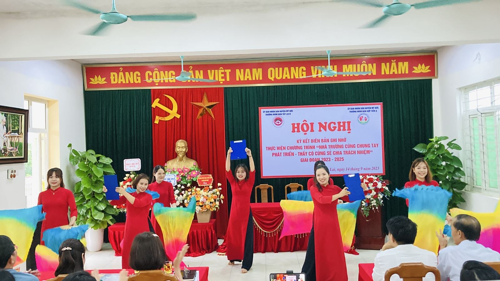 15/09/2023 A- A A+ | Hội nghị ký kết "Nhà trường cùng chung tay phát triển-thầy cô cùng sẻ chia trách nhiệm" Xem Chia s? HỘI NGHỊ KÝ KẾT " NHÀ TRƯỜNG CÙNG CHUNG TAY PHÁT TRIỂN - THẦY CÔ CÙNG SẺ CHIA TRÁCH NHIÊM GIAI ĐOẠN 2023-2025" Thực hiện kế hoạch số 234 ngày 13/4/2023 của phòng GD&ĐT huyện Mỹ Đức về việc tổ chức phong chào "Nhà trường cùng chung tay phát triển-thầy cô cùng sẻ chia trách nhiệm" trên địa bàn huyện Mỹ Đức giai đoạn 2022 - 2025. Hôm nay ngày 14/9/2023 cùng với không khí hân hoan của cả nước chào mừng năm học mới với những nhiệm vụ và mục tiêu mới. Được sự nhất chí, chỉ đạo của phòng GD&ĐT huyện Mỹ Đức, sự thống nhất của lãnh đạo giữa 2 nhà trường.Trường Mầm Non Tuy Lai B và Trường Mầm Non Hợp Tiến A phối hợp tổ chức hội nghị kí kết biên bản ghi nhớ thực hiện phong trào"Nhà trường cùng chung tay phát triển - thầy cô cùng sẻ chia trách nhiệm" giai đoạn 2023 - 2025. -Về dự hội nghị đặc biệt còn có đại biểu của phòng GD&ĐT huyện Mỹ Đức Đ/C Nguyễn Văn Mưu - Cán bộ tổ chức PGD & ĐT, Đ/C Nguyễn Thị Tươi - Chuyên viên tổ trưởng tổ mầm non về dự và chỉ đạo. -Đại biểu của xã Tuy Lai: Đ/c Phùng Đức Trọng phó bí thư đảng ủy cùng các đồng chí đại diện cho đảng ủy HĐND, UBND và mặt trận tổ quốc xã Tuy Lai - Đại biểu của xã Hợp Tiến: Đ/c Nguyễn Văn Bái phó bí thư đảng ủy cùng các đồng chí đại diện cho đảng ủy, HĐND, UBND và mặt trận tổ quốc của xã Hợp Tiến về dự cùng các Đ/C cán bộ, giáo viên, nhân viên cốt cán của 2 nhà trường về dự đông đủ Chương trình hội nghị đã tiến hành và thành công rực rỡ và sau đây là một số hình ảnh của hội nghị! Hai đồng chí lãnh đạo của hai nhà trường thông qua đặc điểm tình hình của trường Hai đồng chí lãnh đạo hai nhà trường trao bản ký kết thương thảo ghi nhớ Đại diện lãnh đạo PGD&ĐT Huyện phát biểu chỉ đạo hội nghị Hình ảnh lưu niệm tại hội nghị Tập tin đính kèm Tải về