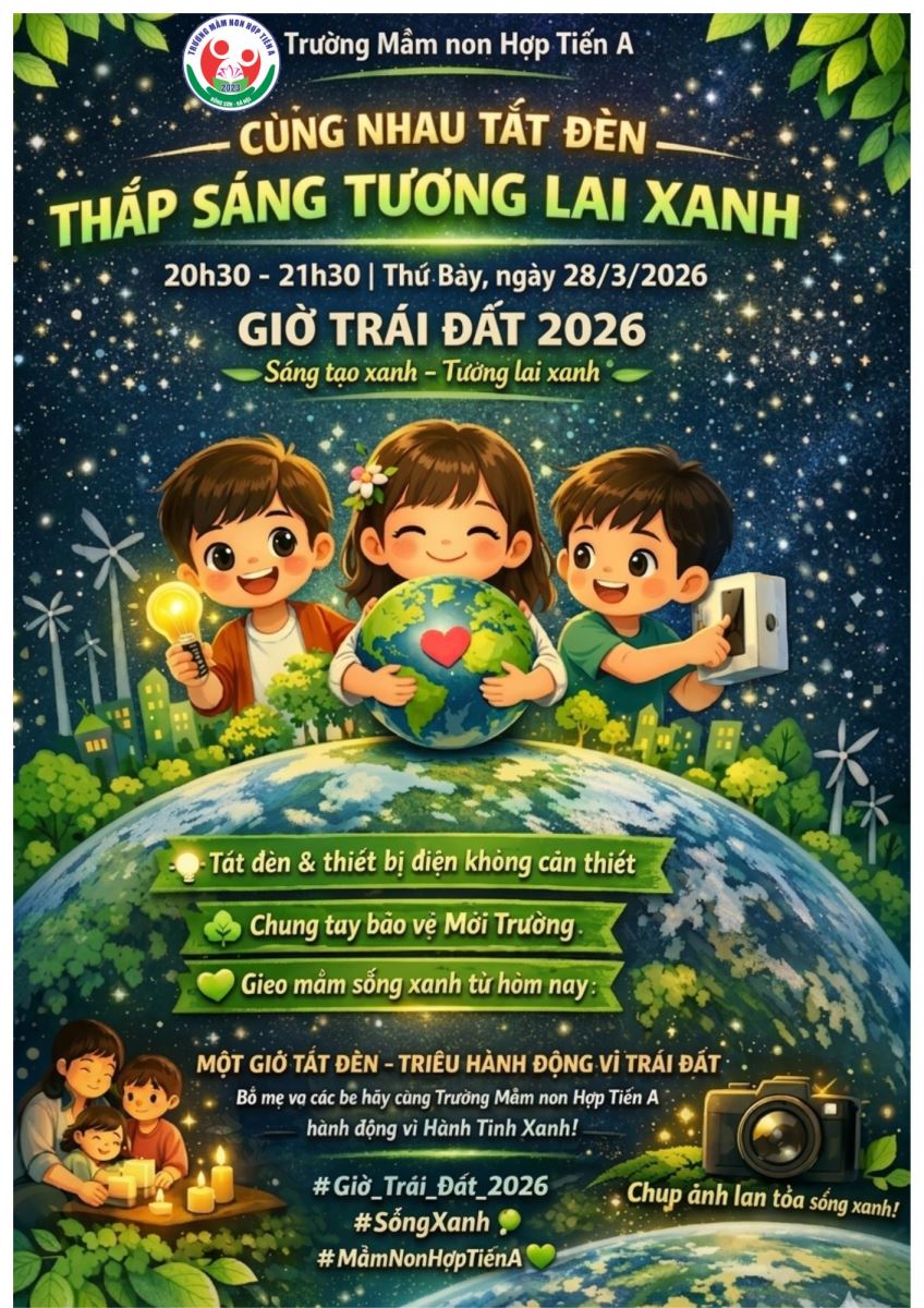 25/03/2026 A- A A+ | HƯỞNG ỨNG GIỜ TRÁI ĐẤT Xem Chia s? 🌍💡 CÙNG NHAU TẮT ĐÈN – THẮP SÁNG TƯƠNG LAI XANH 💡🌍 ⏰ 20h30 – 21h30 | Thứ Bảy, ngày 28/3/2026 Hãy cùng hưởng ứng GIỜ TRÁI ĐẤT 2026 với thông điệp: 🌱 “Sáng tạo xanh – Tương lai xanh”. 🌿 Trường Mầm non Hợp Tiến A trân trọng kêu gọi các bố mẹ và các bé cùng tham gia bằng một hành động thật đơn giản nhưng vô cùng ý nghĩa: 🔌 Tắt đèn và các thiết bị điện không cần thiết trong 1 giờ 🌎 Chung tay bảo vệ môi trường sống 💚 Gieo mầm ý thức sống xanh cho các con ngay từ hôm nay ✨ Một giờ tắt đèn – triệu hành động vì Trái Đất. ✨ Mỗi việc làm nhỏ hôm nay sẽ góp phần gìn giữ một hành tinh xanh – sạch – đẹp cho thế hệ mai sau. 👨👩👧👦 Bố mẹ và các bé hãy cùng Trường Mầm non Hợp Tiến A lan tỏa thông điệp ý nghĩa này nhé! 📸 Đừng quên lưu lại những khoảnh khắc tắt đèn cùng gia đình để lan tỏa tinh thần sống xanh đến mọi người. #Giờ_Trái_Đất_2026 🌍 #SongXanh 🌱 #BaoVeTraiDat 💚 #MamNonHopTienA 💡 Tập tin đính kèm Tải về